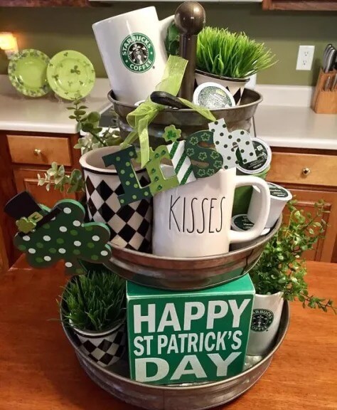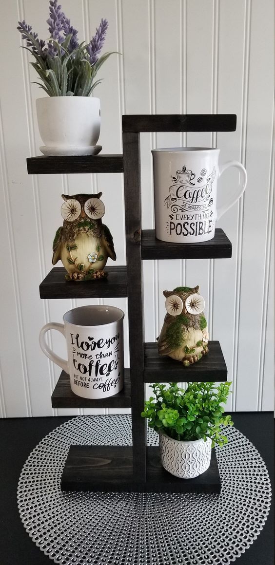 You can place mugs on each tier, tuck in greenery, and add little signs or trinkets for a personalized touch. To make your own, grab a tiered tray (metal or wood works well) and arrange mugs by size and color for balance.