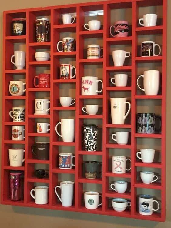 If you have a large mug collection, this bold cubby-style rack is a perfect way to keep everything in order while showing off each piece. The bright red frame adds a striking pop of color that makes the mugs stand out beautifully.