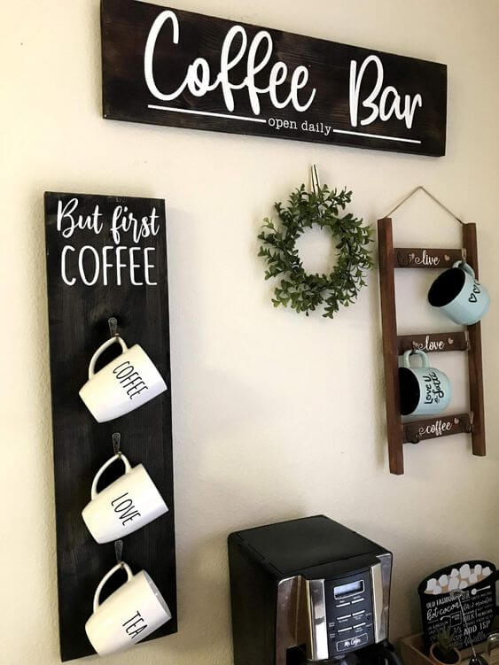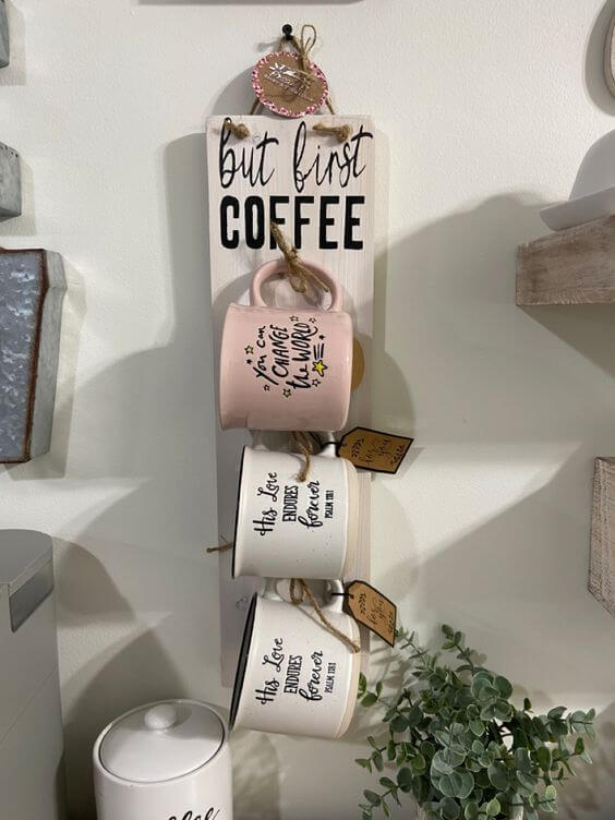 A coffee wall rack with a fun sign instantly gives personality to your coffee corner. This idea combines hooks for your mugs with a wooden sign that says “But first, coffee” or any phrase that makes you smile.