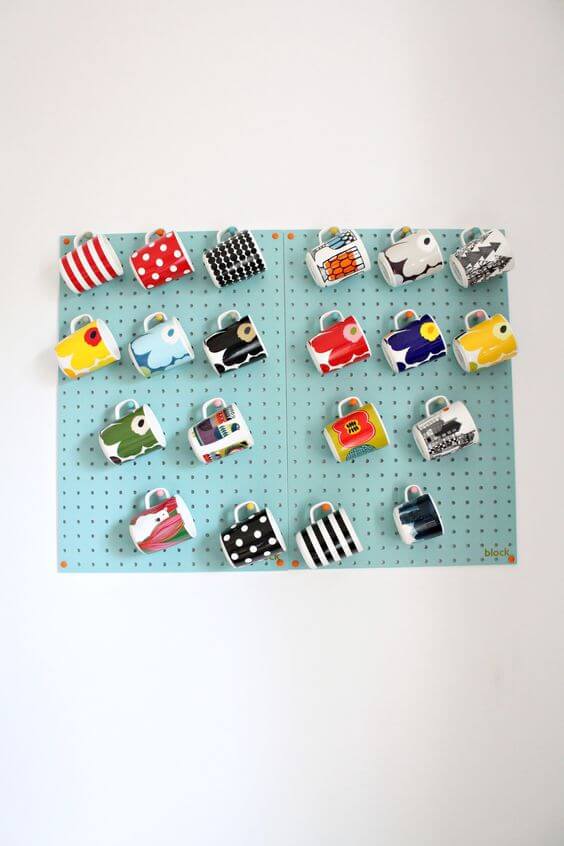 A pegboard makes one of the most practical and playful displays for your coffee mugs. This design lets you arrange mugs in neat rows, almost like a colorful art piece on the wall.