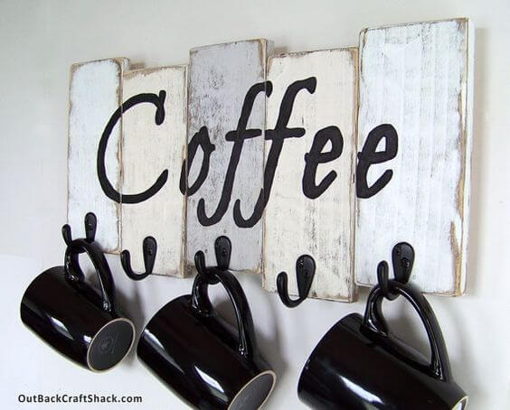 This rustic coffee mug holder turns simple wooden boards into a charming display piece. The distressed paint gives it that farmhouse touch, while the bold “Coffee” lettering makes it clear what this space is all about.