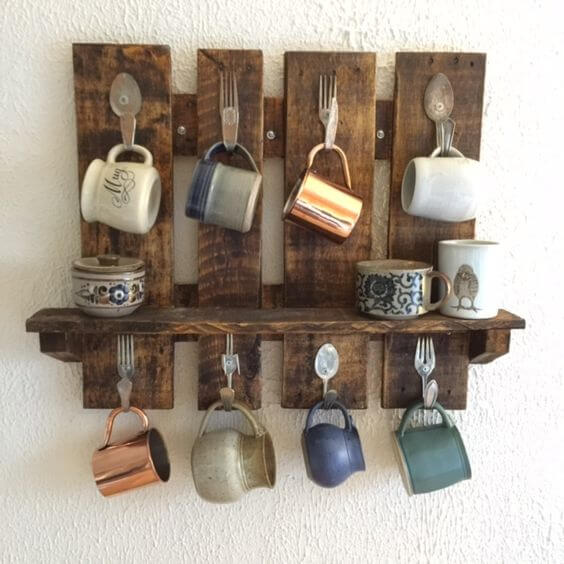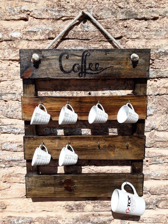 You only need a small pallet, some hooks, and a sturdy rope for hanging to recreate this look. Sand and stain the pallet to bring out the wood s grain, then screw in hooks to hold your mugs securely.