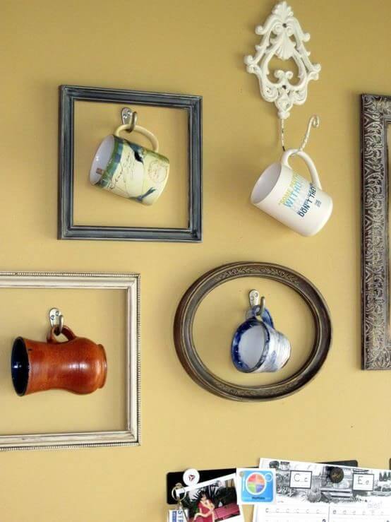 This clever display turns your coffee mugs into works of art by framing them on the wall. Old picture frames are repurposed to surround each mug, creating a gallery-style look that is both fun and functional.