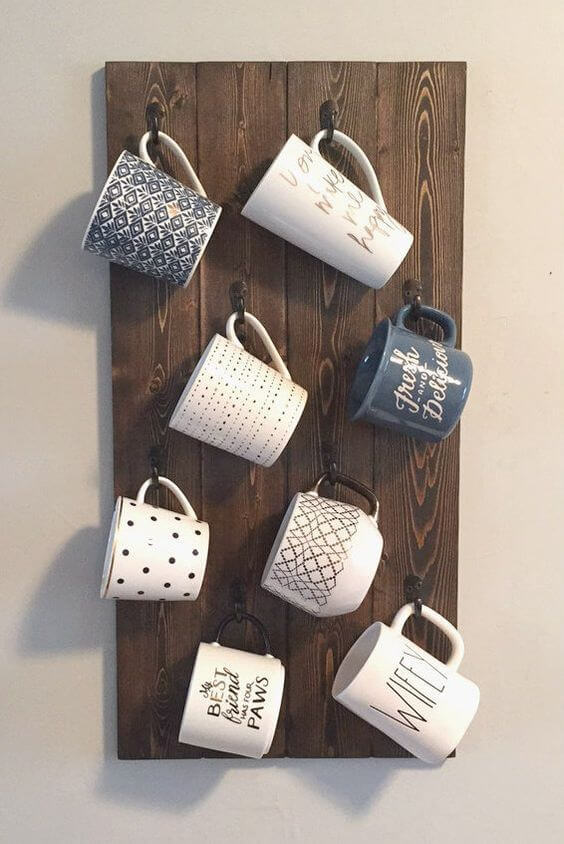 Each hook gives a dedicated spot for your favorite cup, making it easy to grab one whenever you need. You can make your own by attaching hooks to a stained wood plank and hanging it in your kitchen or dining area.