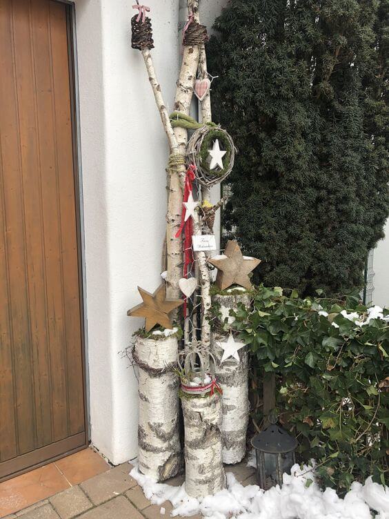 The mix of tall and short logs paired with rustic stars, wreaths, and heart ornaments creates a charming seasonal statement that s both inviting and stylish.