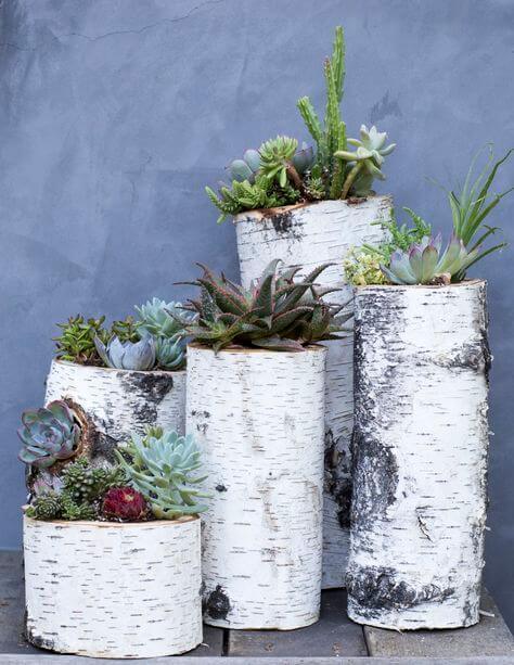 The natural birch bark containers perfectly showcase the varied textures and colors of the succulents, creating a serene and stylish botanical display.