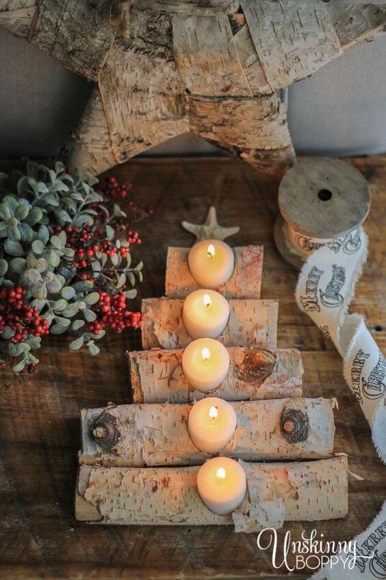 Step 5: Arrange the birch logs on the round base in a cluster, varying heights for visual interest, then light the candles to enjoy the warm, inviting glow.