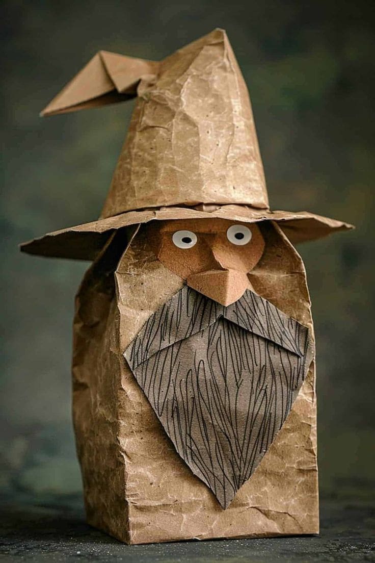 This charming little wizard, crafted entirely from brown paper, feels like it wandered out of a storybook and into your hands. With his long beard, curious eyes, and floppy pointed hat, he s full of personality.