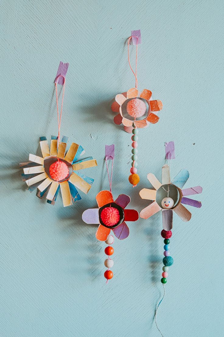 Made from painted toilet paper rolls, fluffy pom-poms, and colorful beads, these little blooms are a sweet way to reuse scraps and brighten up a dull corner. Each flower looks like it s smiling just for you, especially the one with the tiny face tucked in the center.