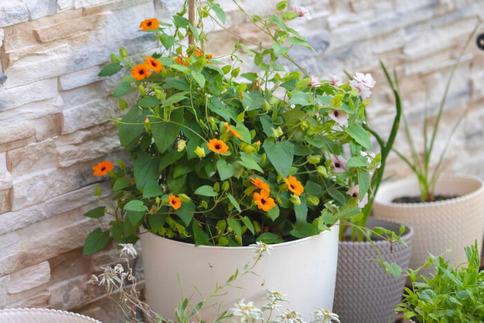 The Black-Eyed Susan Vine produces cheerful, bright flowers with dark centers. Indoors, it needs strong light and a trellis or support to climb. Water regularly during the growing season, but reduce in winter.