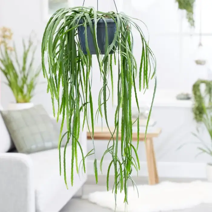 Forest Cactus is a spineless cactus with thick, cascading green stems. It enjoys bright, indirect light and needs only occasional watering. Plant it in a well-draining mix to prevent rot.