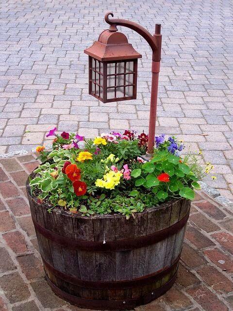 This flower bed is a creative and eye-catching gardening feature that repurposes an old wooden barrel or wine barrel into a unique planter for your favorite flowers, herbs, or other plants.