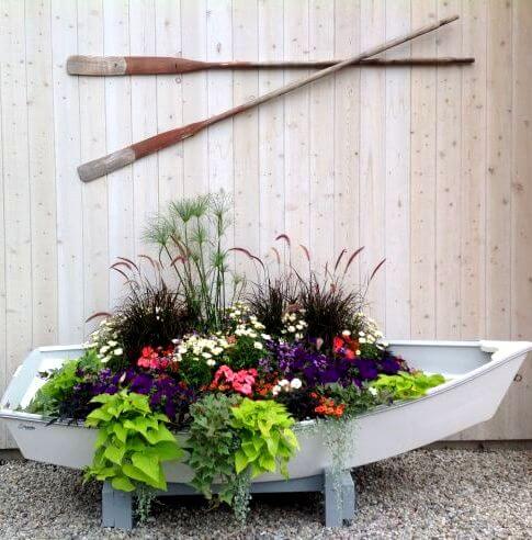 The unique and eye-catching gardening feature repurposes a retired boat, such as a dinghy or rowboat, into a creative planter for your favorite plants and flowers.