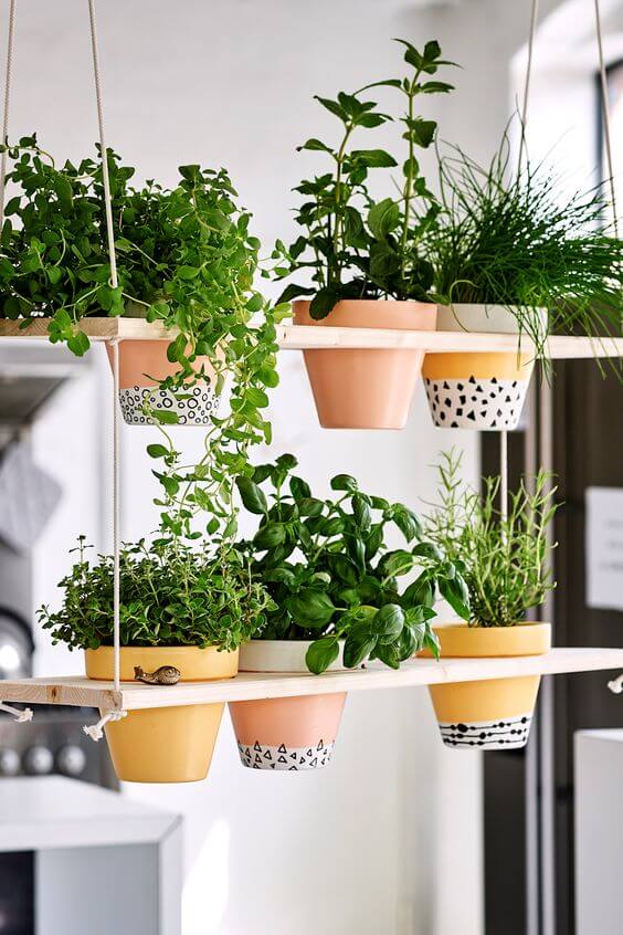 Source: WuestenrotThis colorful herb garden adds a splash of personality right into your kitchen. Brightly painted terracotta pots in peach, coral, and yellow sit snugly on a two-tier wooden shelf that hangs gracefully from thick rope.