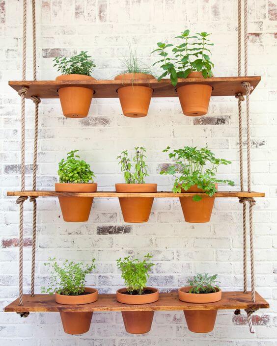 Source: TodeschiniThis rustic hanging garden turns old-school terracotta pots into a cozy, eye-catching display. A thick rope suspends wooden shelves with perfectly cut holes that hold each pot securely in place.