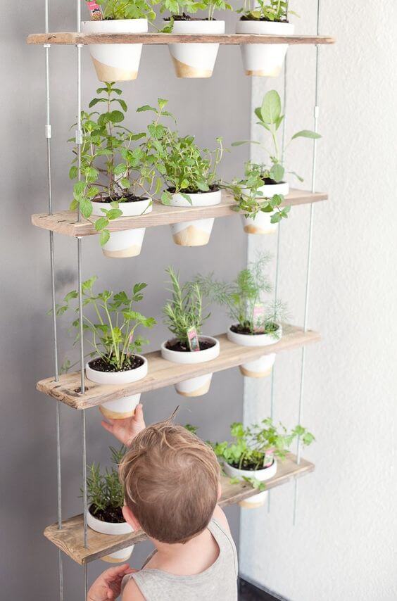 Source: FreshmommyblogThis vertical herb setup blends natural charm with smart design. Each rustic wood shelf cradles white-and-gold clay pots through custom circular cutouts, giving the illusion that the pots are floating midair.