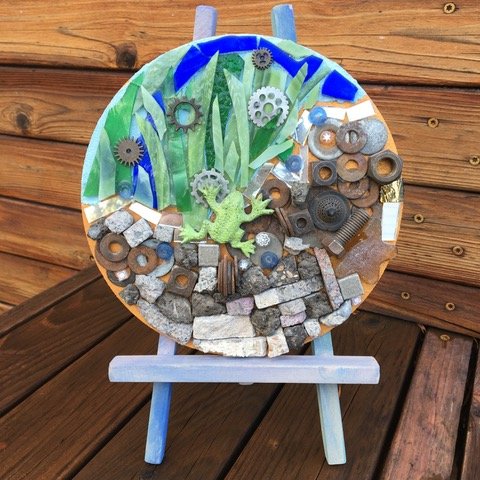 Made from a playful mix of cardboard, fabric, bottle caps, painted textures, and hand-drawn florals, this portrait captures that curious moment when imagination takes over.