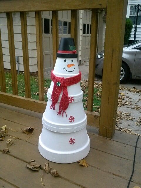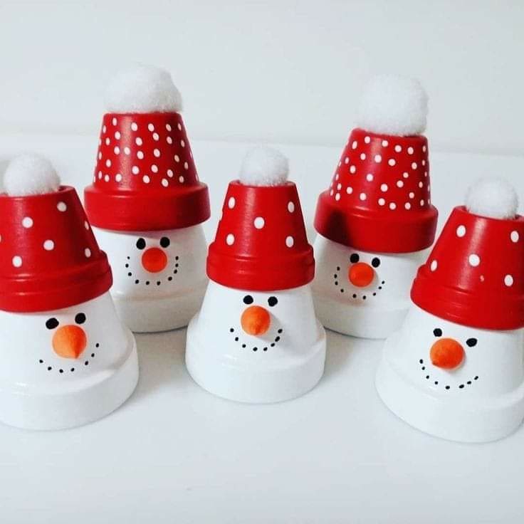 - Paint each clay pot white for the snowman s face and body. Once dry, flip a second pot upside down, paint it red for the hat, and decorate with small white dots. Use a white paint pen or brush tip for even spacing.