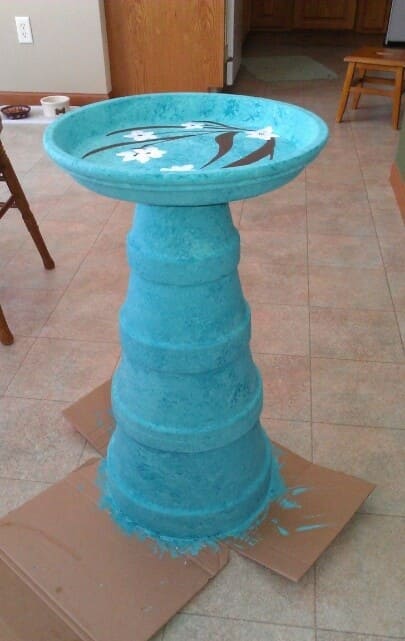 - Paint the entire birdbath, including the stacked base and saucer, using your favorite outdoor paint. I used turquoise for a fresh, calming feel, then added a few simple blossom branches on the saucer using a fine brush.