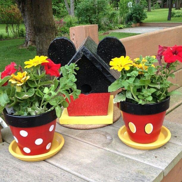 - Paint the clay pots red for the base, and the saucers yellow. Paint the rims of each pot black. Let dry completely, then add white dots (for Minnie) or two yellow ovals (for Mickey s buttons).
