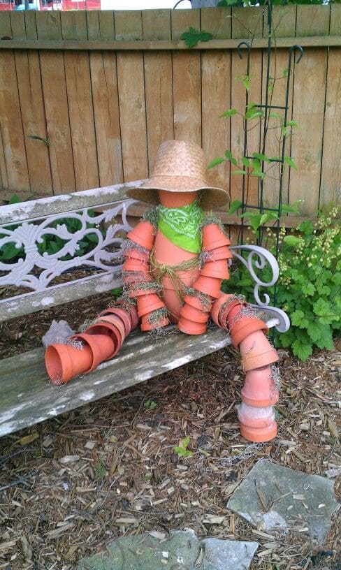 - Use the largest pot as the torso. Thread jute rope or wire through the drainage hole, leaving excess to tie on limbs. Wrap a bandana or cloth around the neck area for personality.