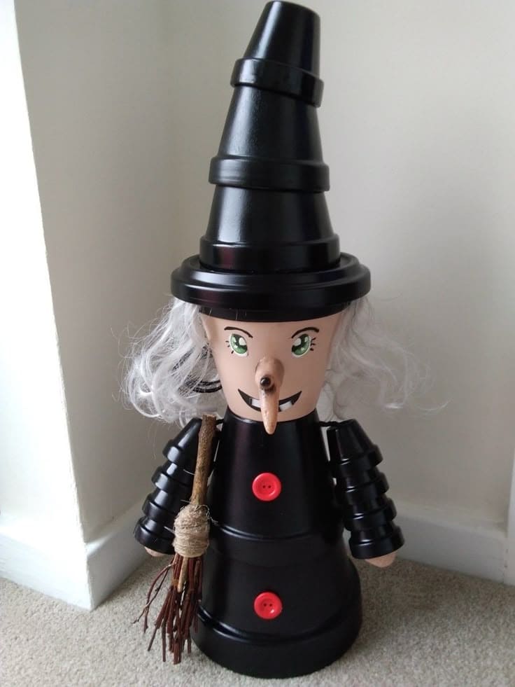 This quirky witch made from stacked clay pots brought a whole lot of cackles and creativity to our entryway last October.