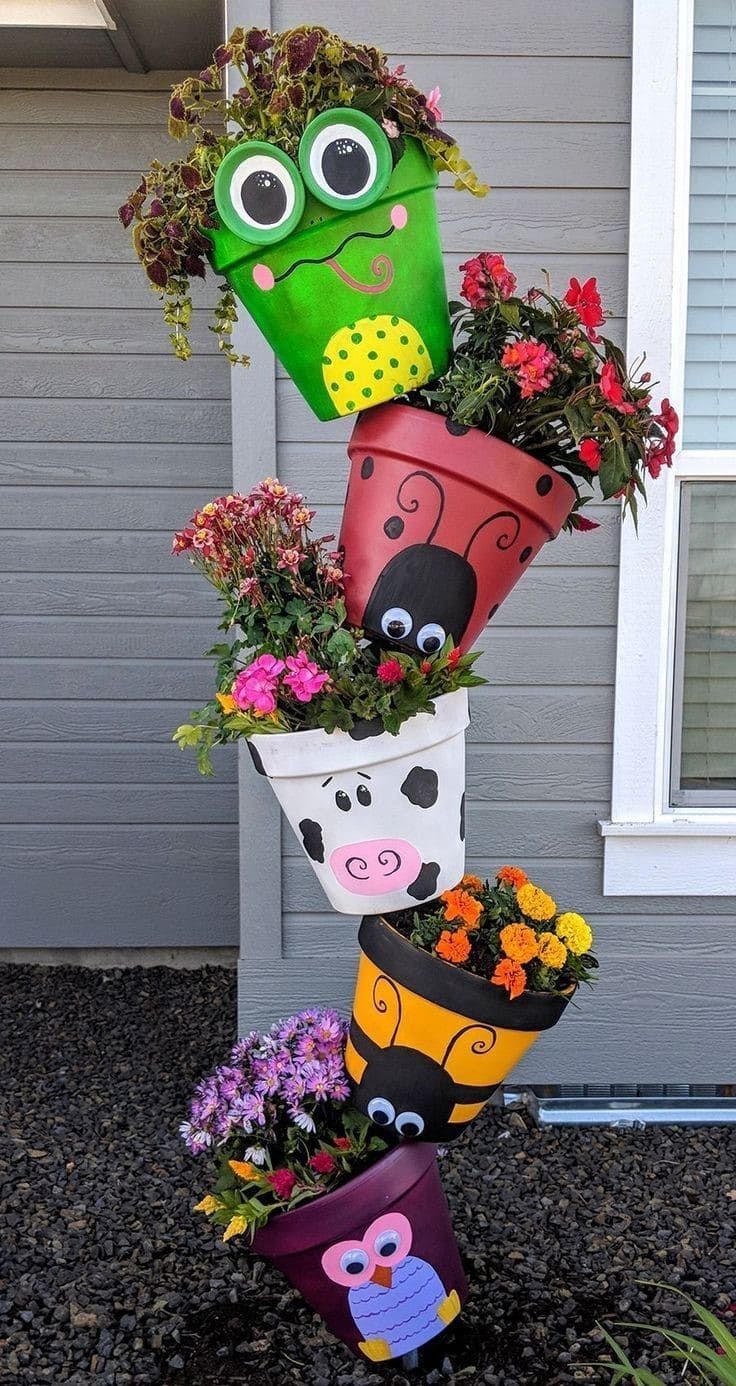 - Add wiggle eyes and any glued details after stacking. Fill each pot with potting soil and colorful flowers.