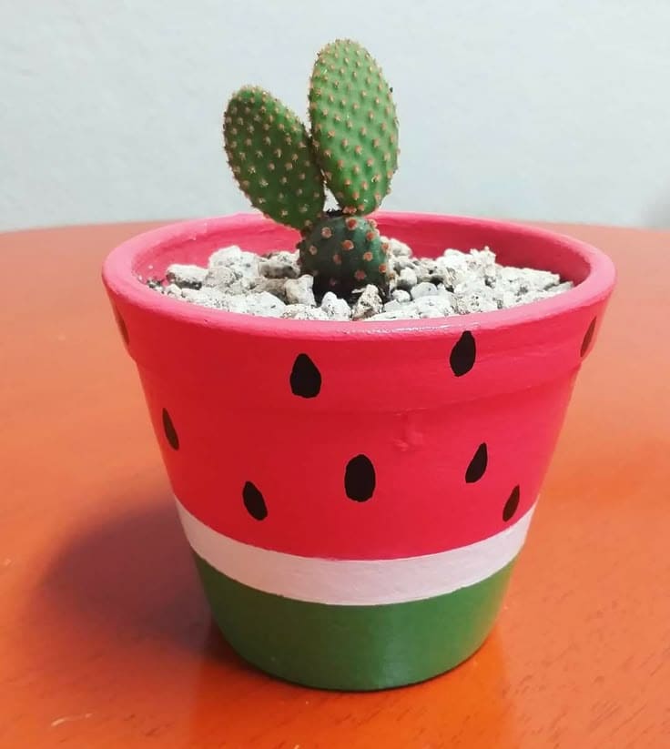 - Paint the bottom third of your clay pot green (the rind), the middle third white (the pith), and the top red or bright pink (the juicy part), then apply a second coat for more vibrancy if needed.