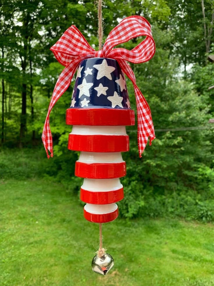 - Cut a long piece of jute twine and tie the silver bell securely to one end. Begin threading the painted pots onto the twine, starting from the bottom. Leave about ½ inch of space between each for movement.