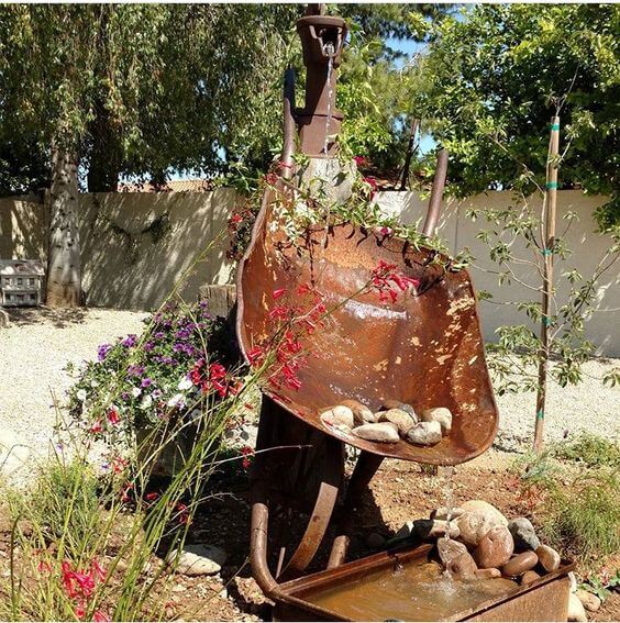 Combine an old water pump and a rusty wheelbarrow for a nostalgic garden piece. Position the pump at one end and let the water pour into the wheelbarrow filled with stones.