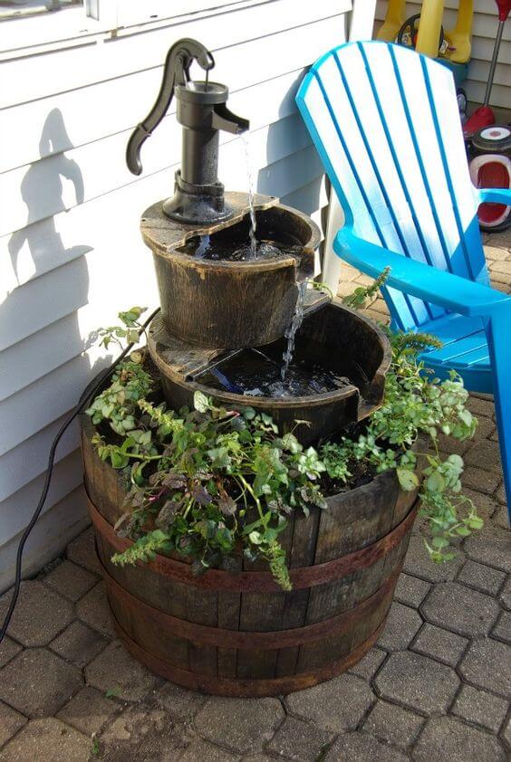Pair a classic hand pump with a wooden barrel for an easy DIY fountain. Fit the pump with a water hose and a submersible pump.