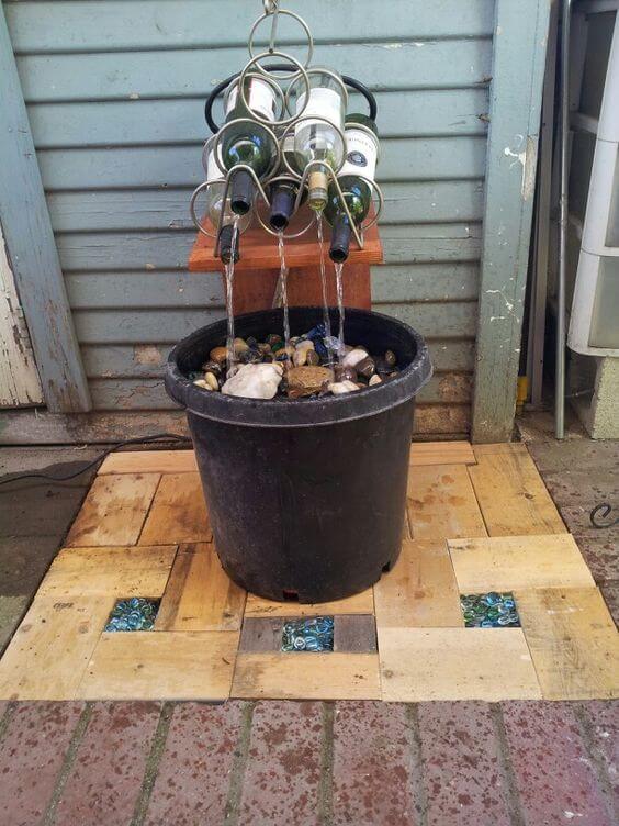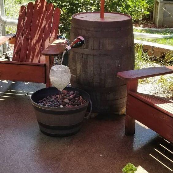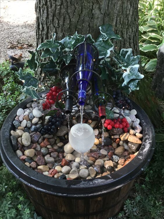 Repurpose a whiskey barrel and a few empty wine bottles into a unique fountain. Drill holes in the bottles and arrange them so the water flows through each.