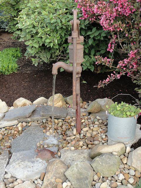 Old well pumps make elegant water features full of history. Mount one over a stone basin and connect it to a small pump system.