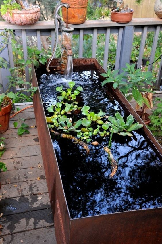 An unused metal trough can be turned into a stunning garden centerpiece. Clean and seal it to prevent leaks, then add a small submersible pump.