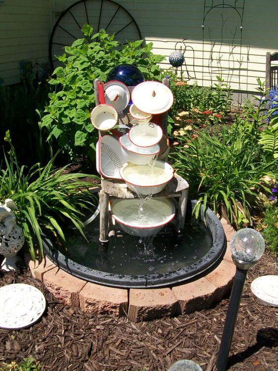 Turn discarded kitchenware into an artistic garden fountain. Attach pots and pans to an old chair frame, allowing water to flow from one into another.
