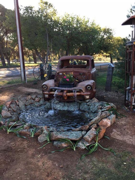 Turn an old toy truck or miniature vehicle into a playful water feature. Insert a small tube to let water flow over the truck s bed into a basin below.