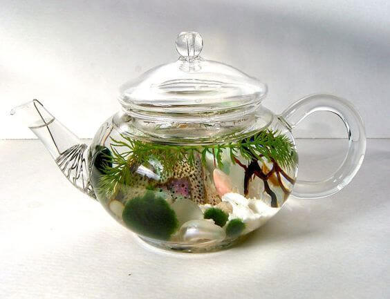 The transparent glass makes every detail stand out beautifully, almost like a living terrarium. To recreate this, fill your teapot with clean water, slip in small aquatic plants, and place a few shells or stones inside.