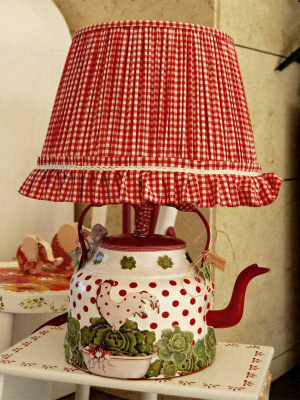 This teapot lamp is a delightful way to give an old kettle a second life while adding warmth to your space. The bold red checkered lampshade pairs beautifully with the polka-dotted teapot, making it a charming farmhouse-style accent.