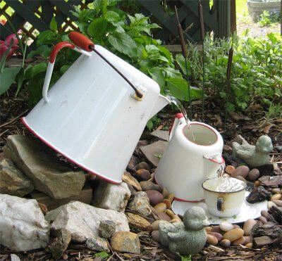 This teapot garden decor idea feels like a little piece of whimsy tucked among your plants. The teapot is tilted on a stand so it looks like it s pouring sparkling beads, giving the illusion of a magical waterfall.
