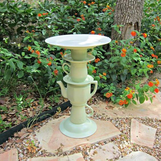 To make it, glue the teapots and cups with a strong waterproof adhesive, then balance the dish securely on top. Place it in a shaded area so the water stays cool, and refill it regularly to keep your feathered visitors happy.