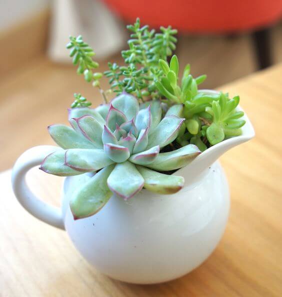 A simple white teapot can make a perfect little home for succulents. Their vibrant greens and unique textures contrast beautifully with the clean ceramic, creating a fresh, modern look.