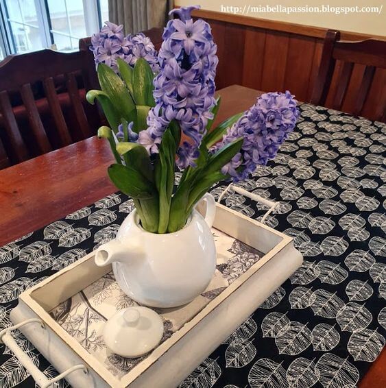 A plain white teapot becomes an elegant planter when filled with fresh blooms like these purple hyacinths. The glossy surface of the teapot contrasts beautifully with the rich colors of the flowers.