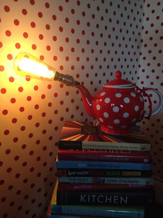 This playful idea turns a simple teapot into a quirky bulb holder that instantly brightens up a space. The red polka-dotted teapot already carries a cheerful vintage vibe, and pairing it with a glowing bulb adds even more charm.