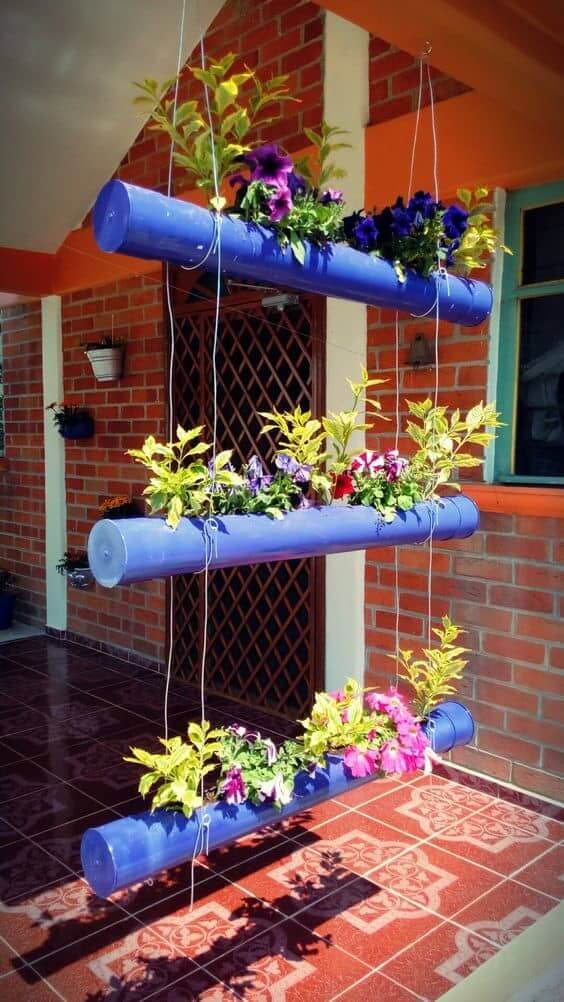 You can use repurposed PVC pipes or buy them new to create a vertical garden that can be suspended from a fence, wall, or any suitable structure in your front yard.
