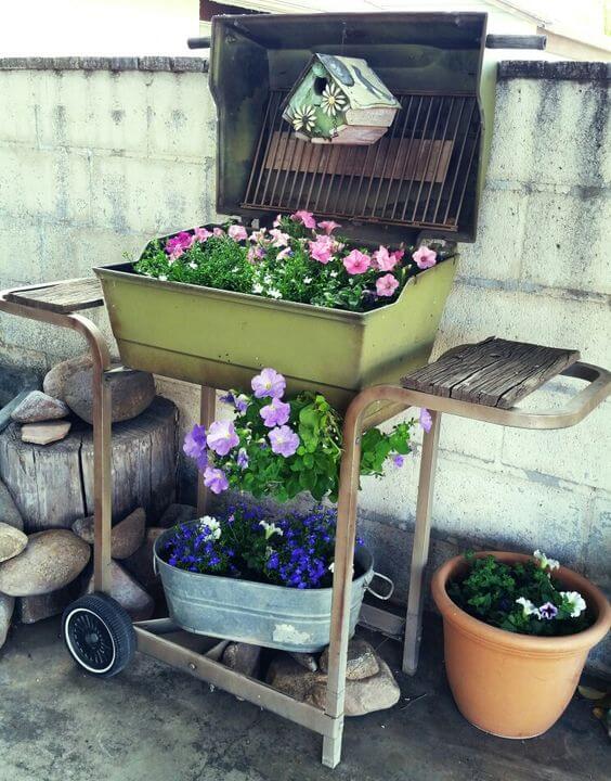 This recycling project is not just about gardening; it’s also a testament to the potential for beauty in unexpected places. It uses an old and weathered BBQ pit into a striking and rustic planter.