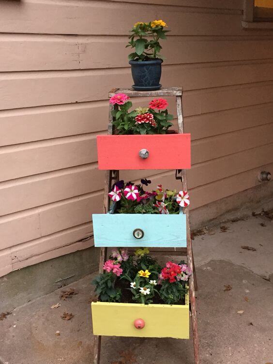 The combination of the ladder’s rustic appeal and the DIY drawers provides an excellent platform for showcasing your favorite plants, herbs, or flowers.