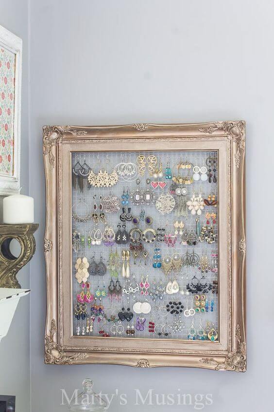 Turn a vintage frame into a practical and stylish jewelry display that keeps all your earrings in one spot. Add a piece of mesh or chicken wire to the back of the frame, and you instantly have a place to hang your favorite pairs.