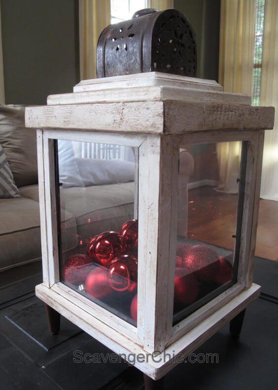 Transform old picture frames into a farmhouse-style lantern by building a square structure with glass panels. The distressed white paint adds rustic charm, while the metal top gives it a vintage look.