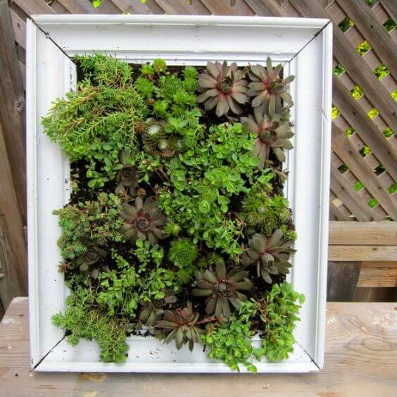 To recreate it, choose hardy plants like succulents that thrive in shallow soil and require little water. Secure wire mesh to the back of your frame, add soil, and tuck your plants in tightly.