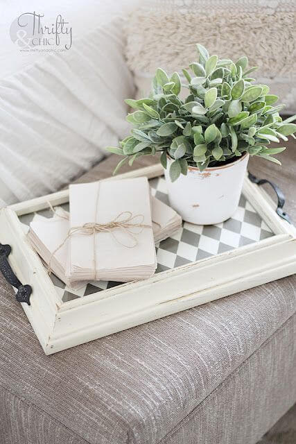 Turn an old photo frame into a stylish serving tray with just a few simple additions. Swap the glass for patterned paper or fabric to create a decorative base, then attach sturdy handles to each side for easy carrying.